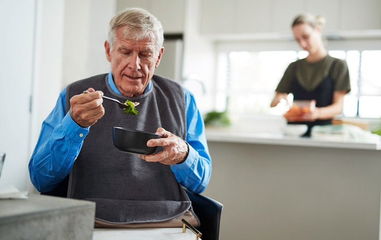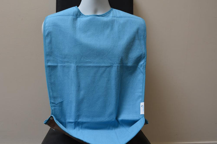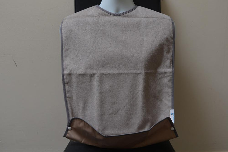 The washable Adult Tray Bib features a generous size with a soft, waterproof backing and a toweling front. It includes snaps on both sides to fold the bottom into a tray for catching dropped food, or you can leave them undone for extra length.