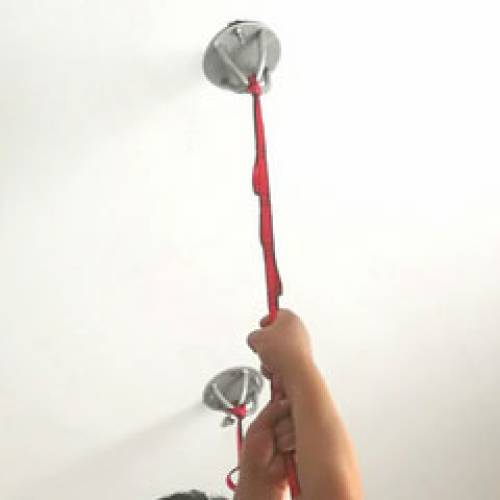 Now you have your anchor plate in place, so you can attach your strap by passing it through the metal ring, then passing it through itself. Now attach the carabiner at the desired height and attach the swing of your choice.