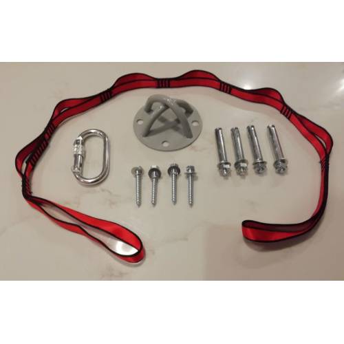 1x Anchor Plate, 4x Expansion Bolts, 4x Wood Screws, 1x Carabiner and 1x Adjustment Strap (110cm) |