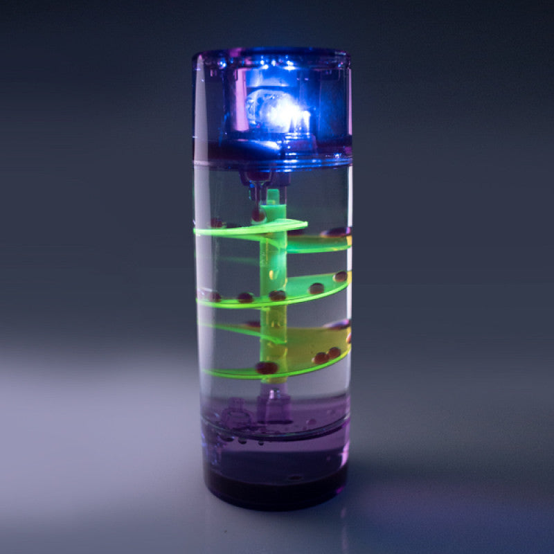 Be mesmerised by the Cosmic Light Spiral! Watch the neon gel droplets spiral down the fluoro yellow ramp for a captivating, calming visual countdown.
