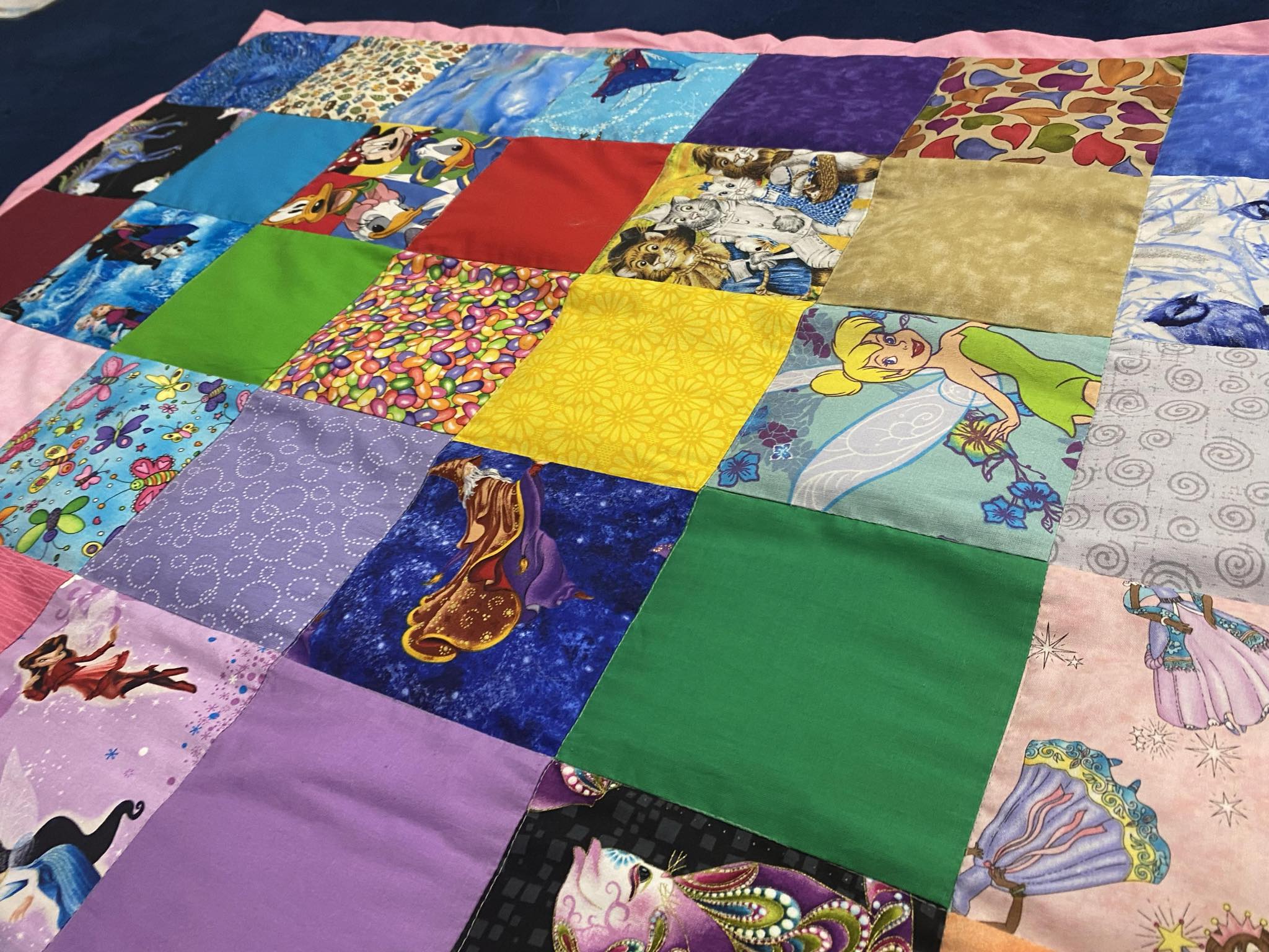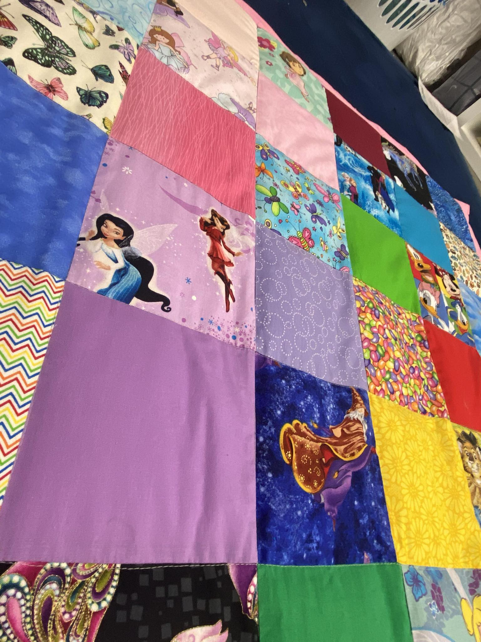 You can choose a backing of Sky Blue, Royal Blue, Purple, Pink and lime green, our seamstrress will make the partchwork squares from fabric we have.