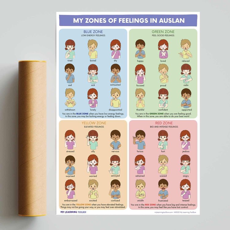Inspired by Leah Kuypers' acclaimed Zones of Regulation, our My Zones of Feelings in Auslan poster serves as a visual guide to assist children in understanding and categorising their diverse emotional landscape using Auslan.