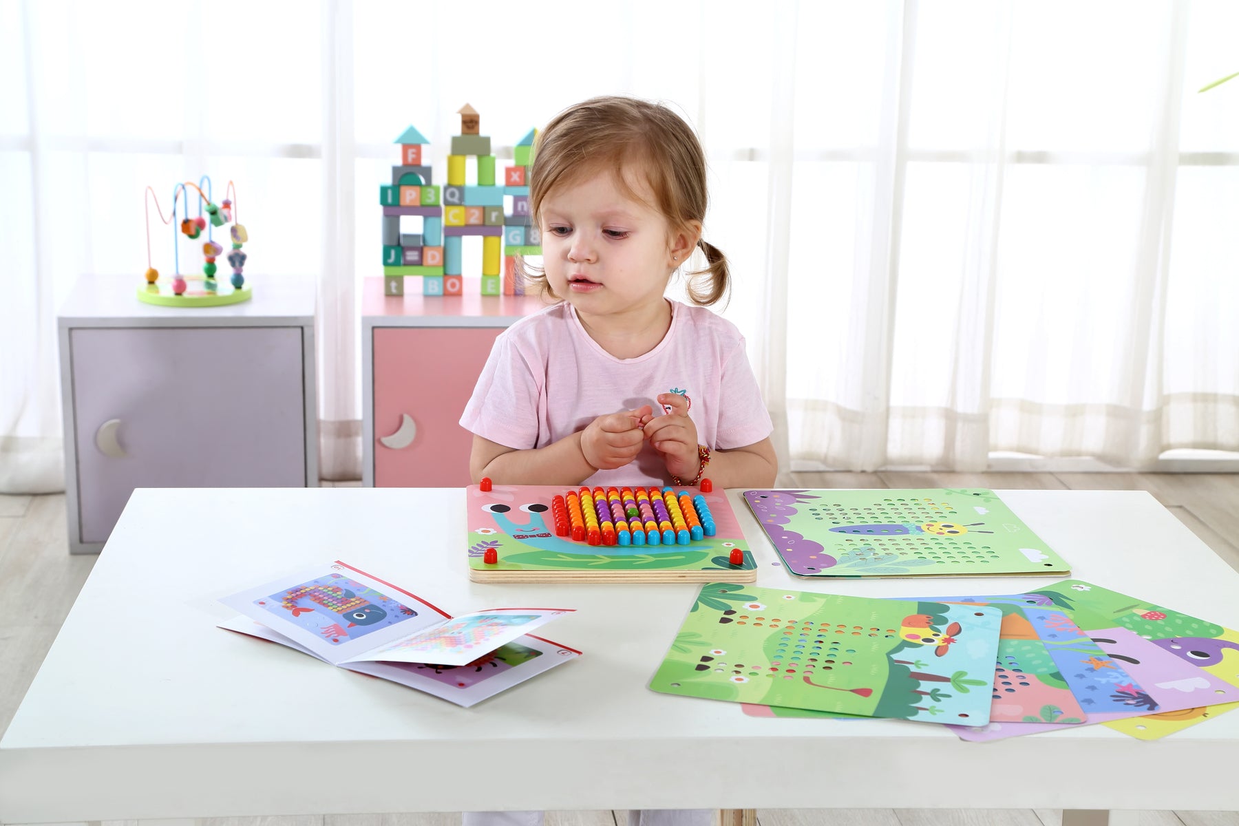 This Pattern Peg Game provides a playful and engaging activity for developing a range of essential skills in young children. The game encourages the development of fine motor skills, specifically pincer grasp and hand-eye coordination, as children manipulate the colorful pegs and place them into the designated holes on the wooden pegboard. Matching the pegs to the pre-printed pattern cards promotes visual perceptual skills, including form constancy and visual discrimination, while also fostering cognitive skills such as pattern recognition, counting, and problem-solving. The activity requires sustained attention and concentration, supporting the development of these crucial foundational skills.