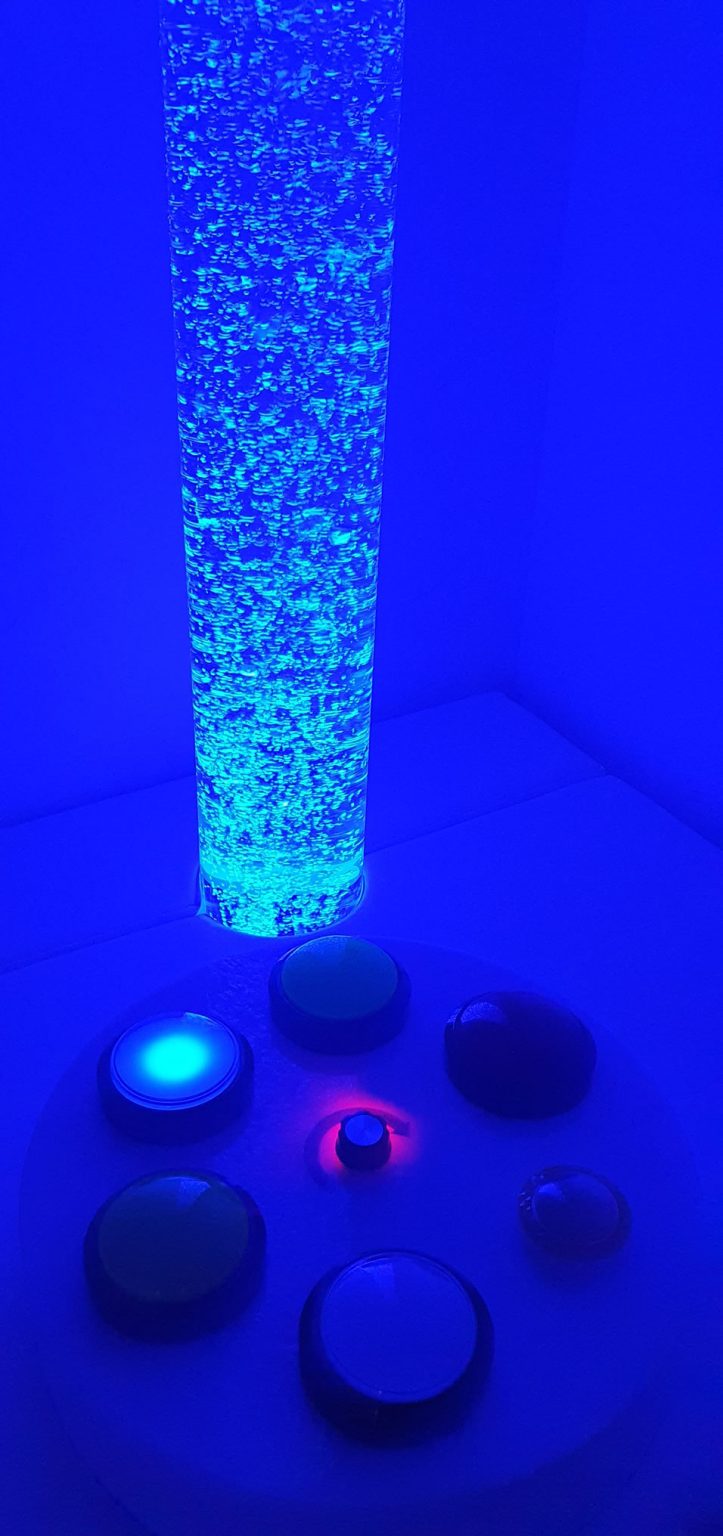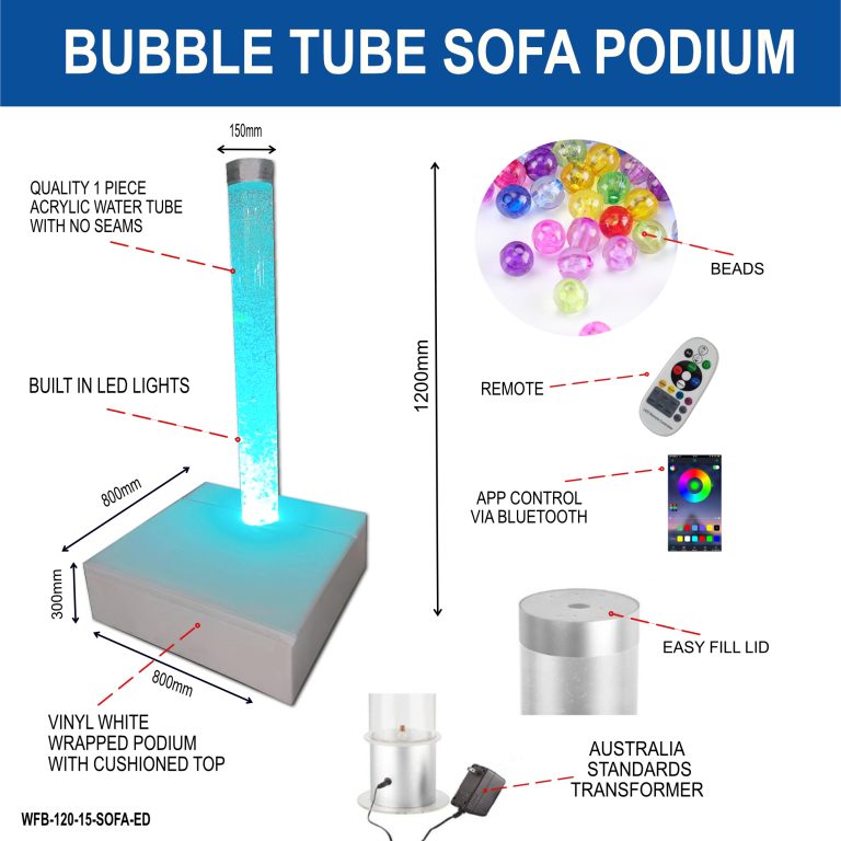 This Complete Sensory Bundle includes a 1.2m Tall Bubble Tube, a wall bracket, and a wireless bubble tube controller switchbox, providing users with the ability to control the color of the lighting, adjust the rate of color transitions, and modify the color interchange sequence. Also included is a fibre optic tails kit and a sofa podium, all designed to support sensory integration and relaxation.