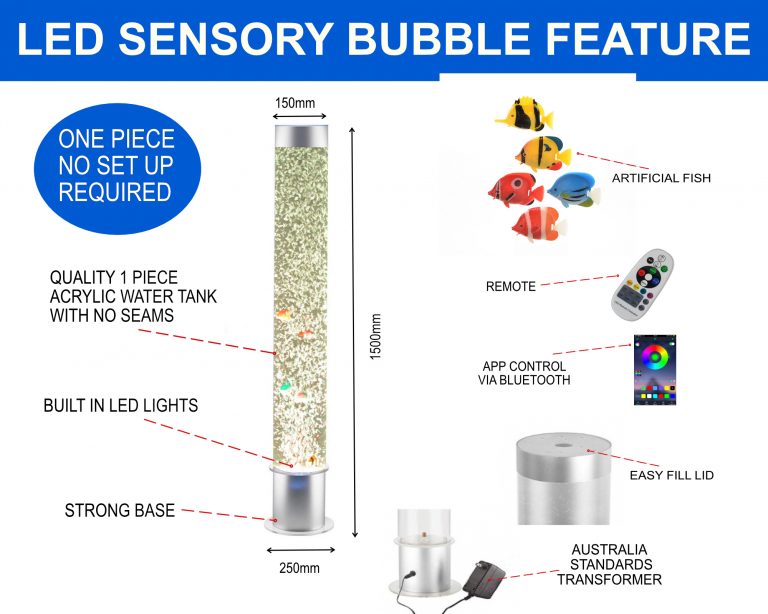 The bubble tube, featuring colour-changing LED lights, provides dynamic visual sensory input, which can aid in promoting sensory regulation, visual tracking, and relaxation for individuals of all ages, including those with sensory processing challenges. The colour transitions can be utilized for calming, focus, and attention, making it an essential tool in therapeutic environments. The unit is self-contained, requiring only distilled water, and stands at 1.5 meters tall with a 15cm diameter. It comes with a PU leather off-white base measuring 80cm x 80cm x 35cm.