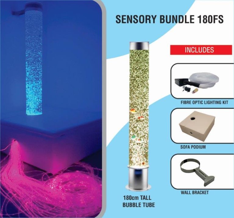 This Sensory Bundle includes a 1.8-meter tall bubble tube, a fibre optic tails kit, and a padded seating podium, designed to enhance sensory processing and support therapeutic outcomes.