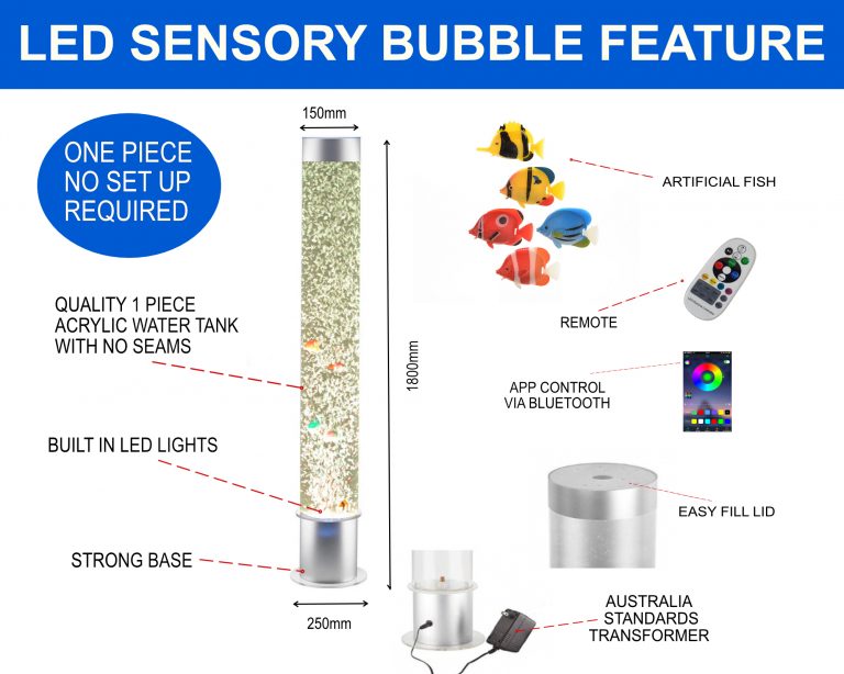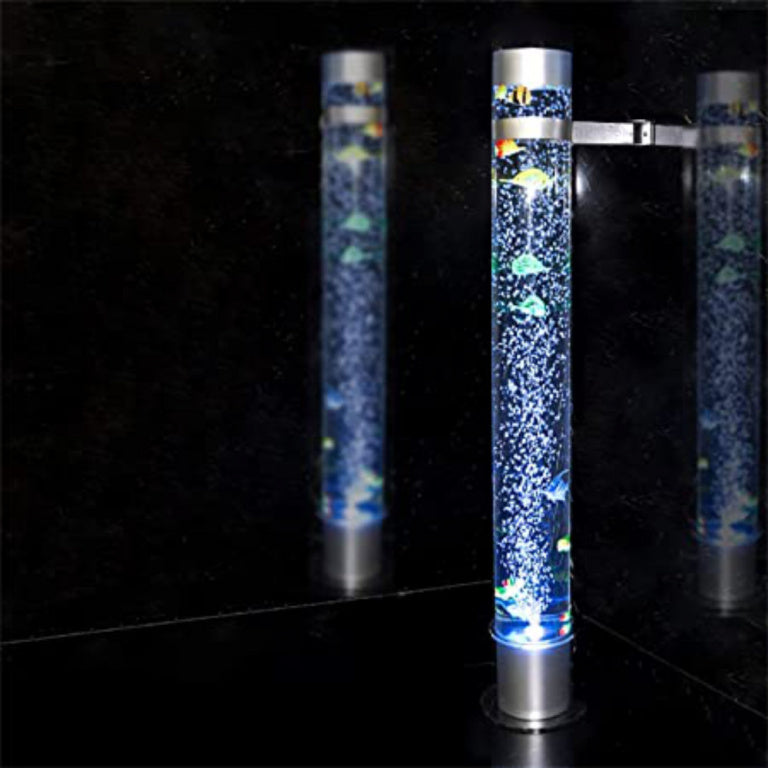 The bubble tube, equipped with colour-changing LED lights, provides dynamic visual sensory input, aiding in sensory regulation, visual tracking, and emotional modulation. The colour transitions offer engaging stimuli, beneficial for individuals of all ages, including those with sensory processing disorders or special needs. The unit is self-contained, requiring only distilled water for operation, and stands at 1.8 meters tall with a 15 cm diameter.