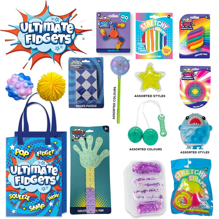 Discover a world of endless fidgety delight with our meticulously curated Ultimate Fidgets Showbag. Contents: Pop Rocker Fidget Windmill Pen Fidget Shapes Fidget Mat Wacky Spinner Stretchy Worms Rainbow Puzzle Rotating Maze Klick Klacks Stretchy Straps Pop Ball 7CM Hand Pop Stress Ball Snake Puzzle Large Ultimate Fidgets Mini Non-Woven Bag Unlock the benefits of fidgeting and keep your hands engaged, whether you’re at home, in the office, or on the go. The Ultimate Fidgets Showbag is a gateway to a world of relaxation and sensory satisfaction.